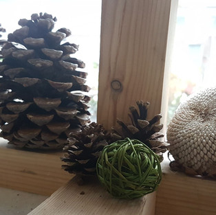 Dennenappels van onze reis naar Engeland , balletjes gemaakt van houten takjes, wat rood jute sterretjes en veel lichtjes!