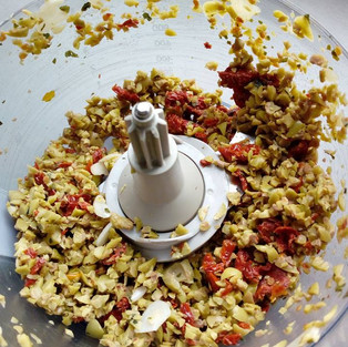 Ondertussen hak je de olijven en tomaten fijn, ik nam olijven waar ook wat knoflook bij zit.